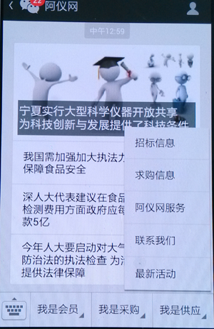 1、我是供應(yīng) 菜單功能有:招標(biāo)信息、求購信息、阿儀網(wǎng)服務(wù)、聯(lián)系我們、最新活動
